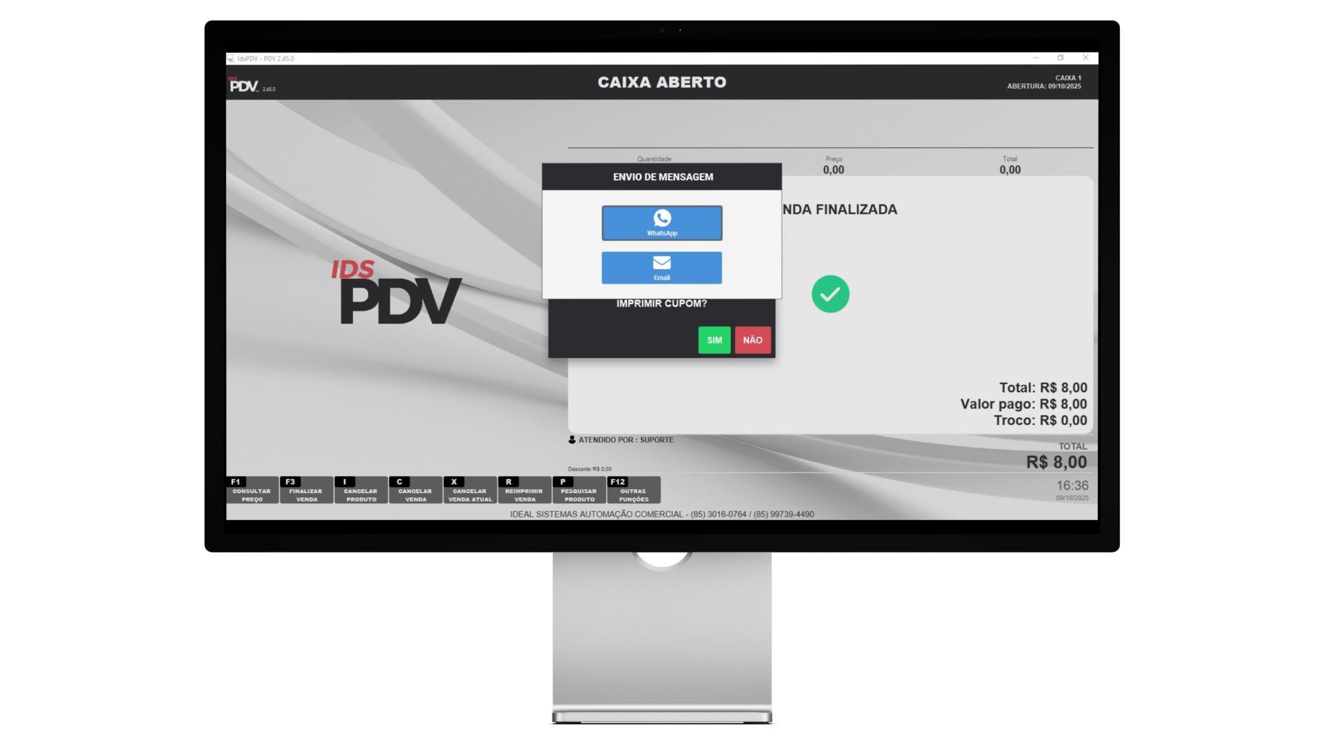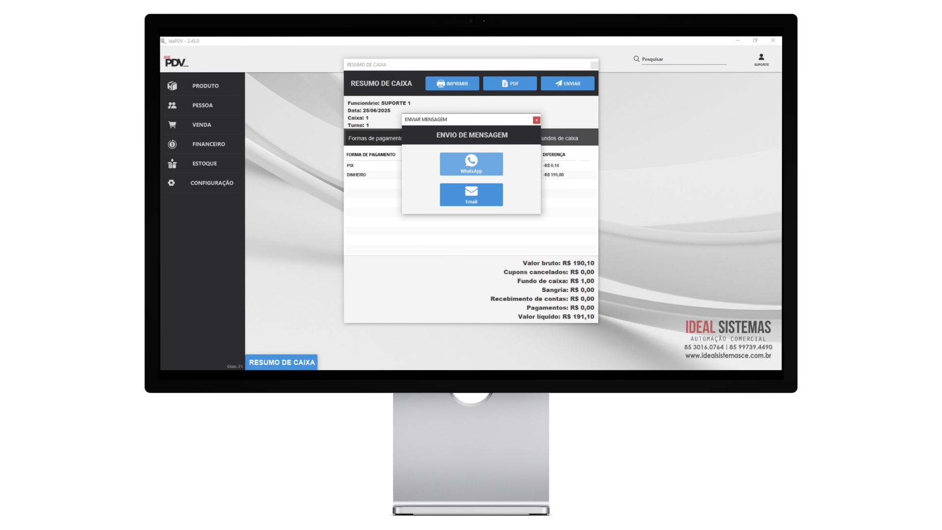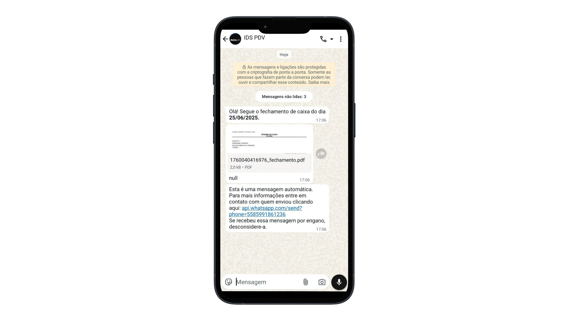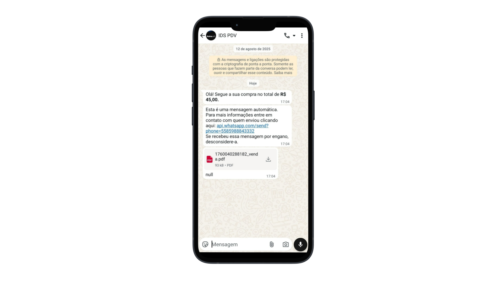 Nosso sistema conta com uma funcionalidade moderna e indispensável: o envio automático de relatórios e cupons fiscais diretamente pelo WhatsApp. Essa funcionalidade transforma a rotina da sua empresa, trazendo mais agilidade, economia e profissionalismo para o seu negócio. Tudo isso integrado ao sistema.